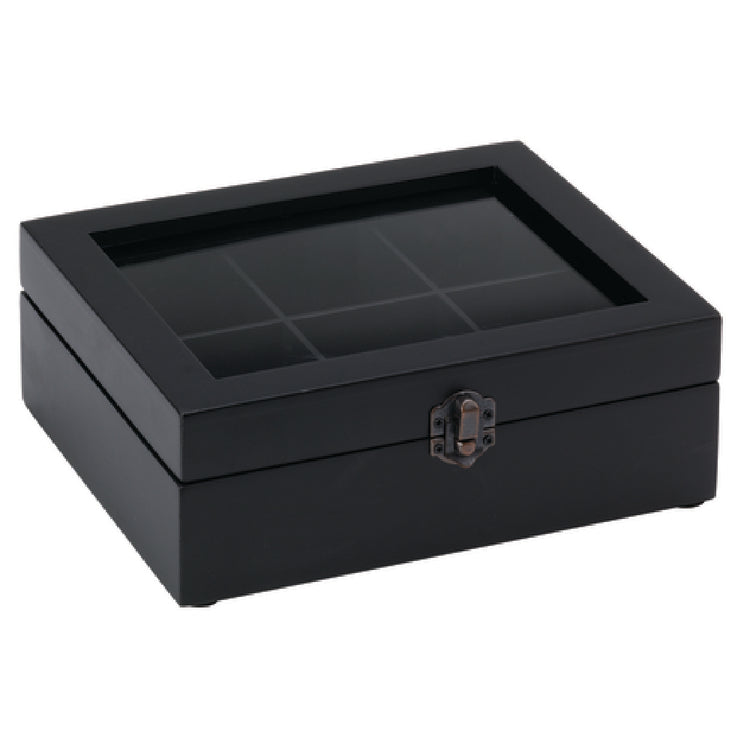 Service Ideas, TB006, Tea Box, 8-1/2" x 7-1/4" x 3"H, (6) compartment, window top, hand wash, metal clasp, beechwood, black (Priced per each, packed 12 each per case)