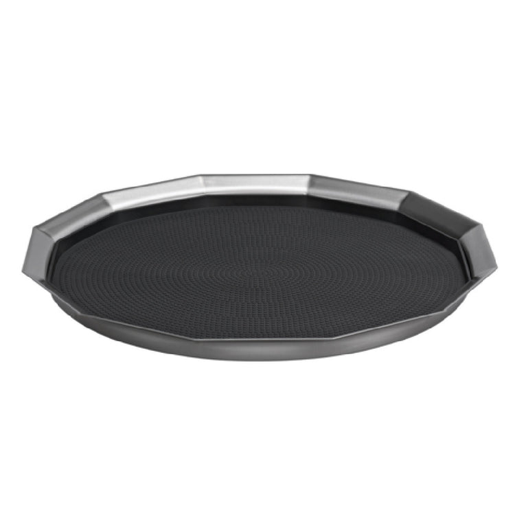 The Service Ideas TRPN1614RIBS Serving Tray Large (12) Panel is a commercial-grade non-skid serving solution designed for high-volume foodservice environments. Measuring 16 inches in both width and depth with a height of 1 inch, this round tray features a brushed stainless steel and black finish. Its main attribute is the integrated non-slip removable insert, providing enhanced stability during service and ease of maintenance, making it suitable for banquet halls, catering, or large-scale catering operations where durability and safety are prioritized.