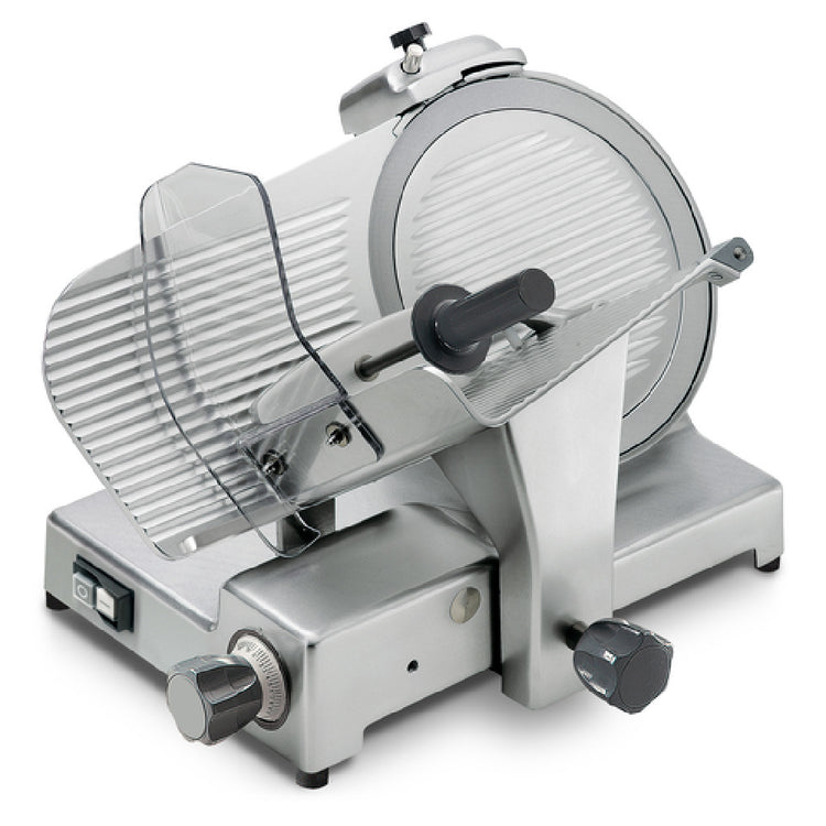 SIRMAN USA, 15304C0G08WNA, CANOVA 300 Food Slicer, heavy-duty, manual, gravity feed, belt driven, 12" dia. knife, tempered chromium-plated carbon steel blade, up to 1/2" slice thickness, removable built-in sharpener, removable carriage with safety hand guard, chromed steel shaft, includes permanent blade rim guard & inner blade guard, self-lubricating bushings & bearings, fan-cooled motor, anodized aluminum alloy, 1/2 HP, 375 watts, 120v/60/1-ph, 1.55 amps, UL, ETL-Sanitation