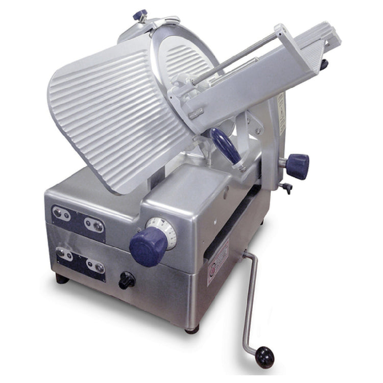SIRMAN USA, PALLADIO 330 EVO AUTOMEC VV, (153349GUBVFNA) Food Slicer, electric, heavy-duty, semi-automatic, gravity feed, belt driven, 13" dia. tempered chromium-plated carbon steel blade, up to 1" slice thickness, removable built-in sharpener, removable carriage with safety hand guard, chromed steel shaft, includes permanent blade rim guard & inner blade guard, self-lubricating bushings & bearings, fan-cooled motor, overload & no-volt release protection, (2) electronic keypads with on/off buttons, anodized aluminum construction, 1/2 HP, 410 watts, UL, ETL-Sanitation