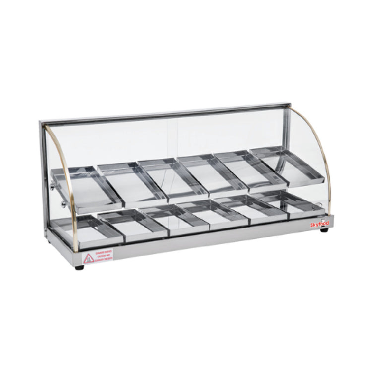 The Skyfood Equipment FWDE2-37 Economy Line Heated Deli Display Case Countertop is a commercial-grade food presentation unit designed for countertop use in foodservice operations. Featuring a curved front glass design and a polished stainless steel frame, this display case provides excellent visibility and durability. Equipped with two adjustable shelves and included stainless steel trays, it facilitates efficient hot food display and service. The thermostatic controls enable precise temperature regulation, ensuring food safety and quality. At 36-5/8 inches wide with a 500-watt heating system operating on 110V/60Hz single-phase power, it is suitable for mid-volume restaurant, cafeteria, and catering environments requiring reliable heat retention and easy access for staff.