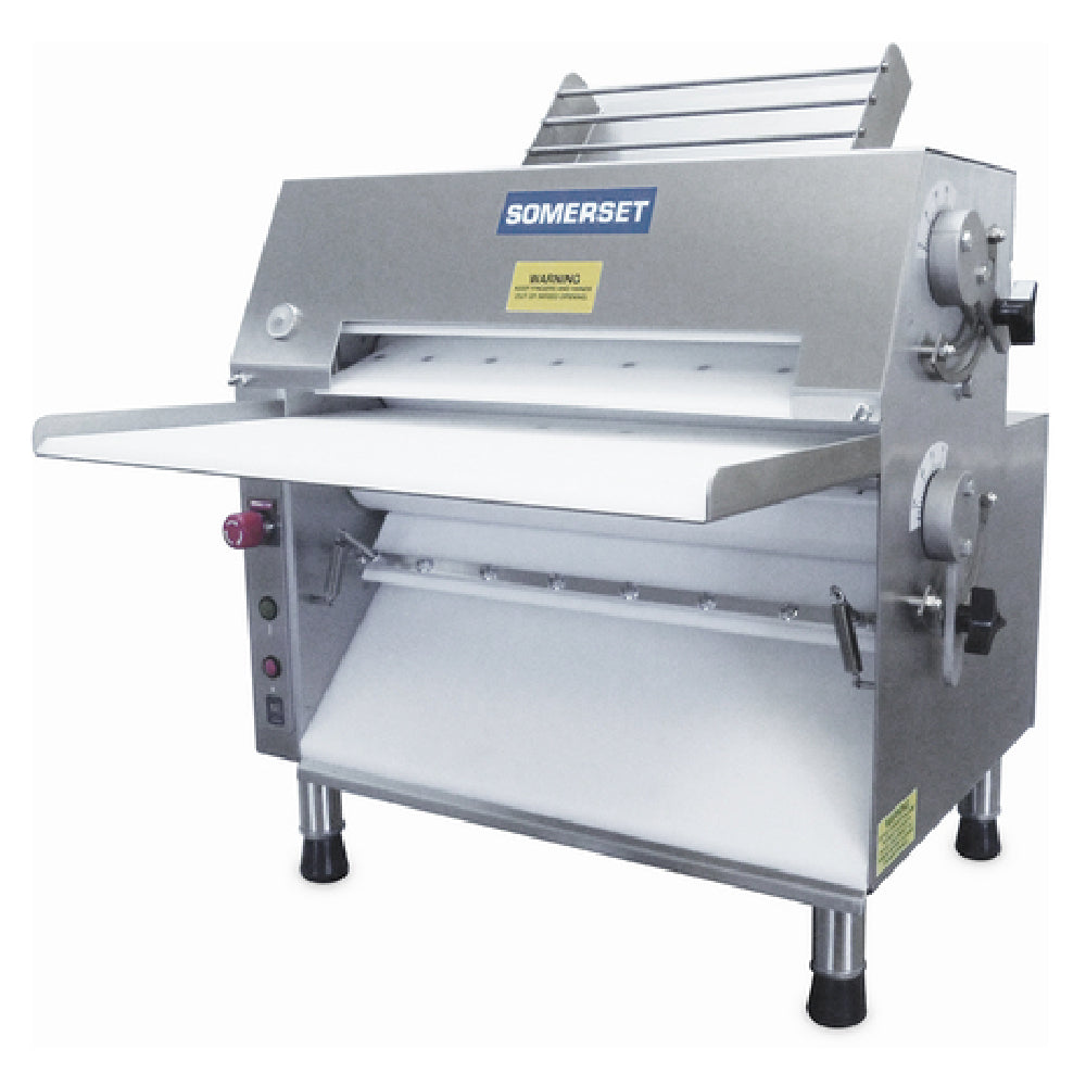 The Somerset® Dough Roller CDR-2500 offers precise dough sheet control with adjustable thickness settings, high-capacity processing of up to 600 pieces per hour, and durable stainless steel construction for easy sanitation. Its front operation design allows quick adjustments, while safety sensors prevent accidental engagement, making it ideal for high-volume bakery production and commercial kitchens.