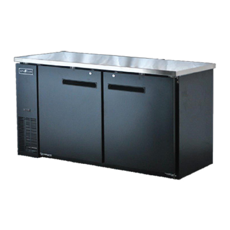 Spartan Refrigeration, SBBB-60, Back Bar, 60.75", two-section, 15.8 cu. ft., left side mounted self-contained refrigeration, hinged solid doors, (4) adjustable shelves, digital temperature control, interior lighting, stainless steel top, black vinyl exterior, 304 stainless steel interior, R290 Hydrocarbon refrigerant, 1/3+ HP, 115v/60/1-ph, 7.5 amps, NEMA 5-15P, cETLus, ETL-Sanitation