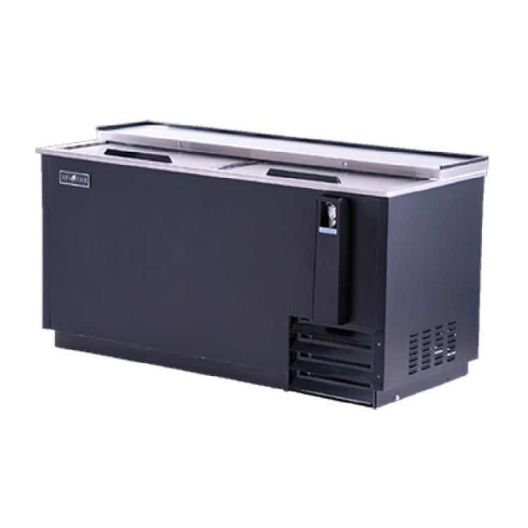 The Spartan SBC-65 Bottle Cooler features a 1/6 HP compressor integrated into a self-contained refrigeration system, powered by a 115V/60Hz single-phase circuit with a 5-15P plug. Its exterior finished in all black-coated steel housing measures 64.5" wide, 26.75" deep, and 34.25" high, totaling approximately 254 lbs. The unit is equipped with side-mounted refrigeration for efficient energy use and optimal airflow, utilizing R290 hydrocarbon refrigerant for eco-friendly cooling. Designed with durability in mind, it features a coated aluminum interior and stainless steel slide lids with locking mechanisms. The interior accommodates up to 22 cases of 12 oz. bottles or 32 cases of cans, with adjustable dividers for flexible organization. The unit operates within a temperature range suitable for beverage storage, ensuring product integrity and sanitation.