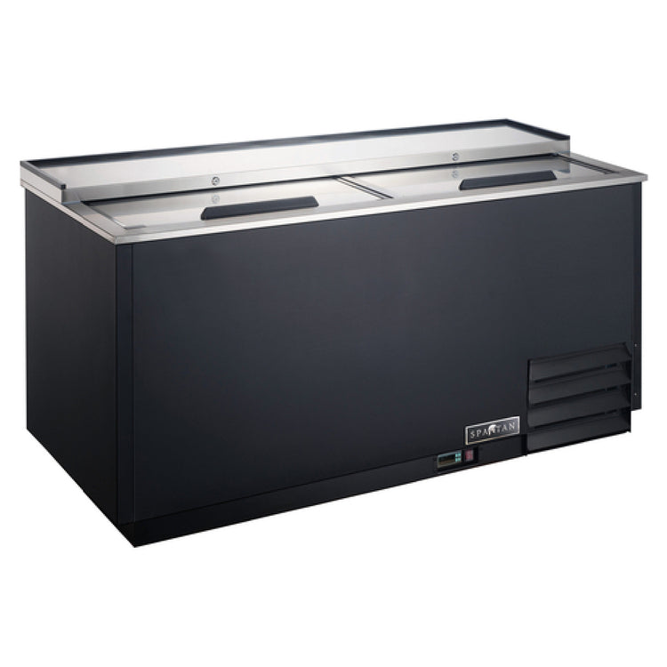 The Spartan SBGF-50 Glass Froster is a commercial refrigeration unit designed for high-capacity storage of beer steins and mugs in professional foodservice environments. This top-sliding door unit measures 49.5 inches in width, 26.75 inches in depth, and 34.25 inches in height, accommodating up to 240 (10 oz.) steins or 250 (8-inch) mugs. Featuring self-contained front-mounted refrigeration, this glass froster ensures efficient cooling with environmentally friendly R290 hydrocarbon refrigerant, operating at 1/4 horsepower and 115V power. Its coated aluminum interior and black vinyl-coated steel exterior provide durability and ease of sanitation, suitable for busy bar and restaurant settings requiring reliable product presentation and rapid access. The unit’s adjustable dividers and stainless steel sliding lids with locks optimize workflow, sanitation, and security during storage and retrieval of glassware.