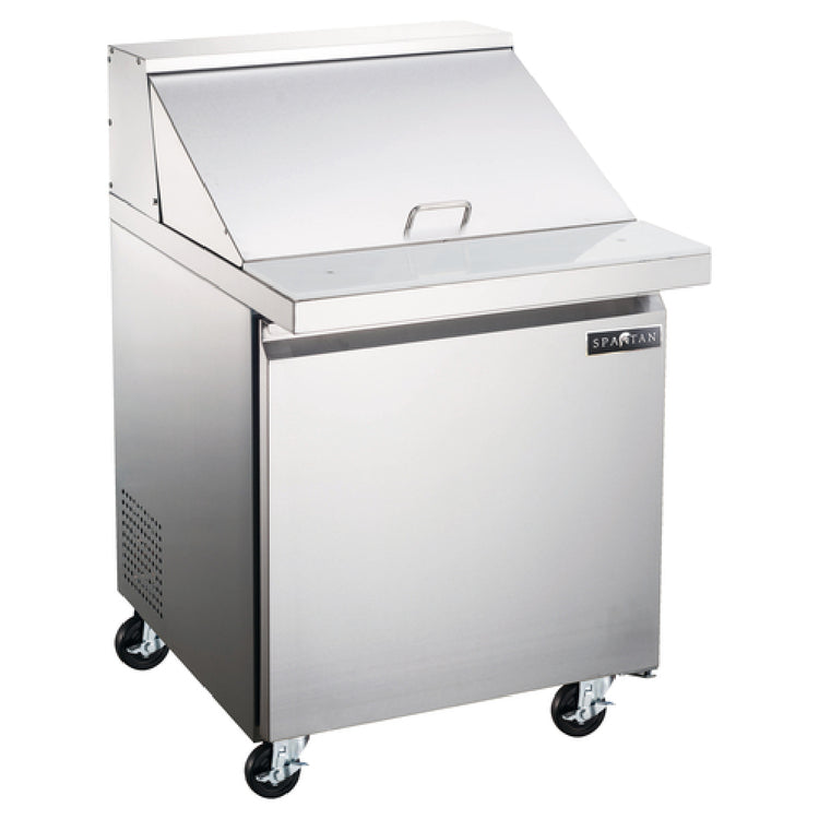 The Spartan SST-27-12 Mega Top Sandwich and Salad Prep Unit is a commercial refrigerated counter designed for high-efficiency kitchen operations. This single-section unit features rear-mounted self-contained refrigeration ensuring optimal temperature stability for fresh produce, salads, and deli ingredients. With a 5.75 cu. ft. capacity, it supports foodservice environments requiring reliable cold storage alongside prep stations. Constructed with a durable stainless steel exterior and interior, it is built for rigorous use in restaurant, sandwich shop, or cafeteria settings. Its integrated digital temperature control allows precise monitoring, while the ¾" thick cutting board provides convenient food preparation. The unit's standard configuration includes a self-closing stainless steel door, adjustable plastic-coated steel shelving, and mobility benefits through four casters, including two locking for stability. Powered by R290 hydrocarbon refrigerant, it maintains efficient cooling at 120V, making it suitable for commercial kitchen integration and workflow management.