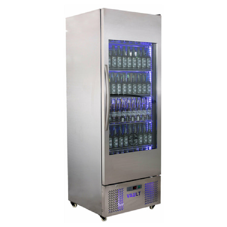 A commercial back bar cooler is a refrigerated unit designed for beverage storage and display behind bars, restaurants, and hospitality venues. It typically features glass doors for visibility, durable construction, and precise temperature controls suitable for beer, wine, or mixed drinks. The Spartan VR-18 Vault Beer Cooler is equipped with a self-contained, rear-mounted refrigeration system, 18 cu. ft. capacity, and a stainless steel exterior, making it ideal for high-volume beverage service environments such as bars and foodservice facilities that require consistent cooling and professional presentation of chilled drinks.