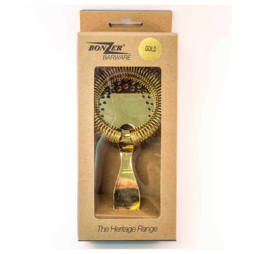 The Bonzer Hawthorne Strainer's stainless steel design provides exceptional durability and corrosion resistance suitable for commercial bar use. Its 2-prong configuration facilitates secure attachment to cocktail shakers and mixing glasses, enabling efficient filtering of liquids. The gold plated finish offers corrosion protection and an attractive appearance, while the individually boxed packaging ensures safe handling and storage. Engineered for ease of use, it simplifies the workflow in high-throughput bar environments without compromising robustness. The 0.26 lbs weight and standard size make it compatible with most beverage prep setups, integrating seamlessly into professional bar stations and drink service operations.