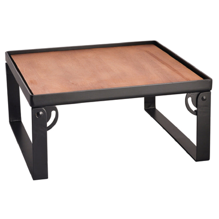 The Spring USA SK9431 Skyra™ Industrial Riser is a commercial-grade display riser designed specifically for foodservice environments requiring durable presentation platforms. Measuring 9-1/2 inches in length and width with a height of 4 inches, this square riser features a hardwood top for a premium look and matte black stainless steel folding legs for stability and portability. Crafted to meet the demands of professional kitchens, catering setups, and retail displays, the Skyra™ riser offers precise dimensions for versatile use in high-traffic commercial settings, facilitating efficient product presentation and elevated service displays.