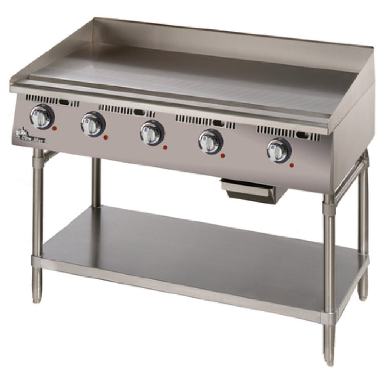 The Star 772TA Ultra-Max® Heavy Duty Griddle offers robust performance with a smooth steel cooking surface, precise thermostatic control, and durable stainless steel construction. Its 72-inch width supports large-scale meal production, while the 1-inch thick griddle plate ensures optimal heat retention. Designed for easy cleaning, it includes a front grease trough and a 6-quart grease drawer, suitable for high-volume operations. The welded steel frame enhances durability, and adjustable 4-inch legs facilitate installation on uneven surfaces. This griddle withstands intensive use in commercial settings, making it ideal for cafes, diners, and institutional kitchens that require consistent, high-capacity cooking.