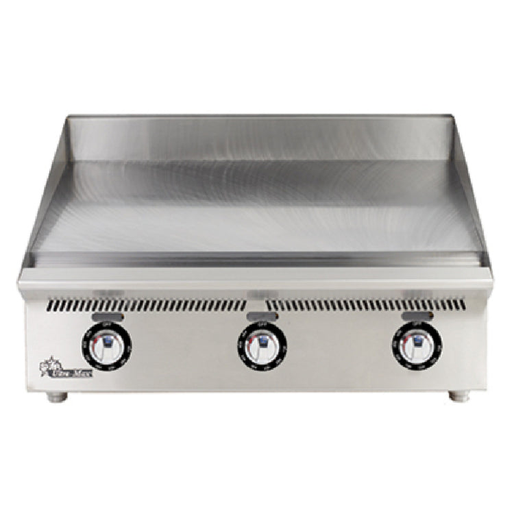 Star (Middleby), 836MA, Ultra-Max® Griddle, countertop gas, 36" W x 24" D cooking surface, 1" thick polished steel griddle plate, (3) manual controls, 4-3/8" tapered wrap-around splash guard, 3-1/2" front grease trough, heavy-duty metal knobs, standing pilot, welded steel frame with stainless steel exterior, 4" stainless steel legs with 1-3/8" adjustment, 90,000 BTU, cULus, UL EPH Classified, Made in USA