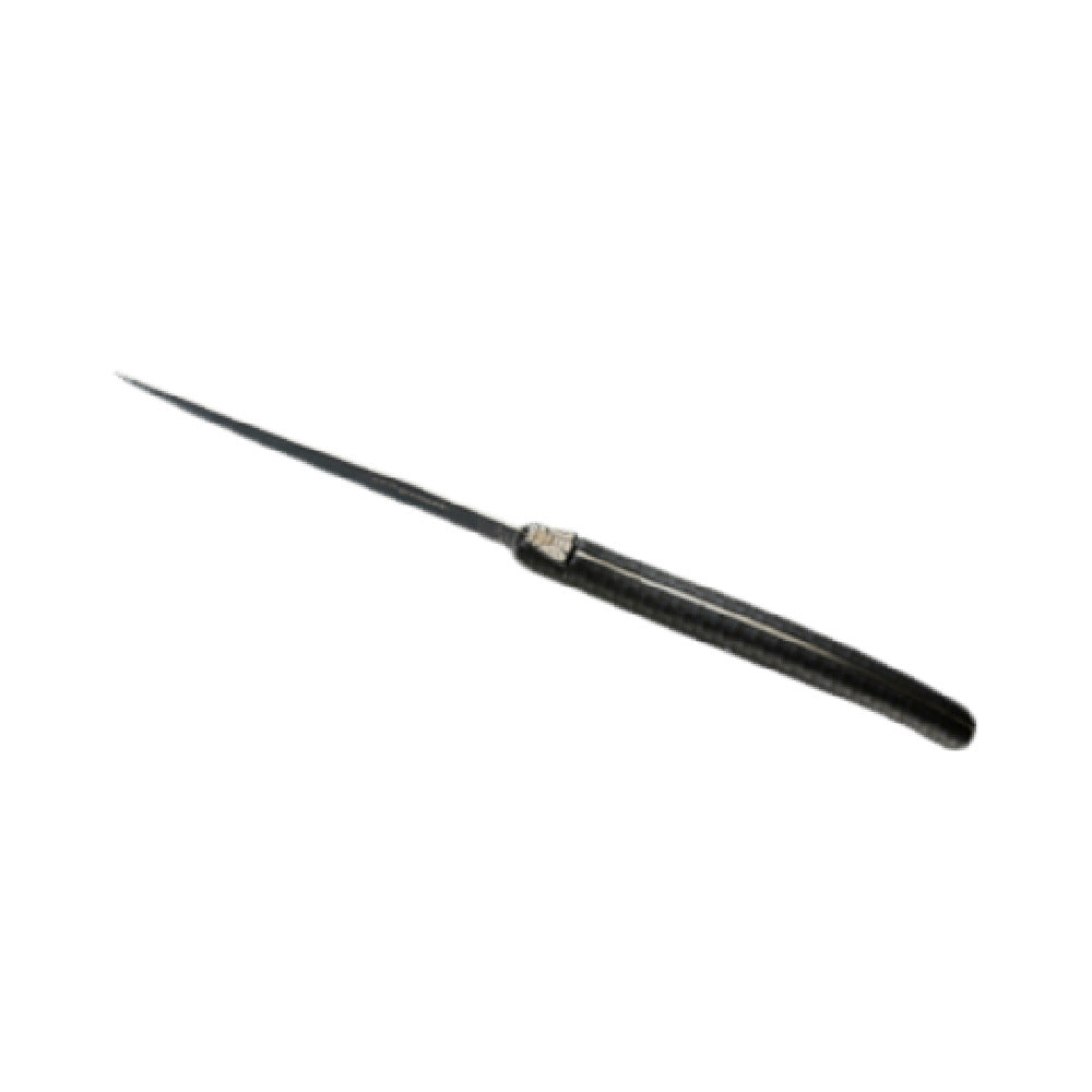 This commercial-grade steak knife features a forged style with a robust 13/0 stainless steel blade measuring approximately 8 to 9 inches overall, with a blade thickness of 1.5 mm for durability and sharpness. The handle material is carbon fiber in a sleek black matte finish, providing strength and a secure grip. The knife weighs roughly 0.6 lbs, making it comfortable for prolonged use. Designed for professional kitchens, it withstands rigorous cleaning routines and regular use without degradation. It ships without certification but adheres to industry-standard manufacturing practices for commercial cutlery. The knife's dimensions and construction are optimized for high-performance slicing and carving tasks.
