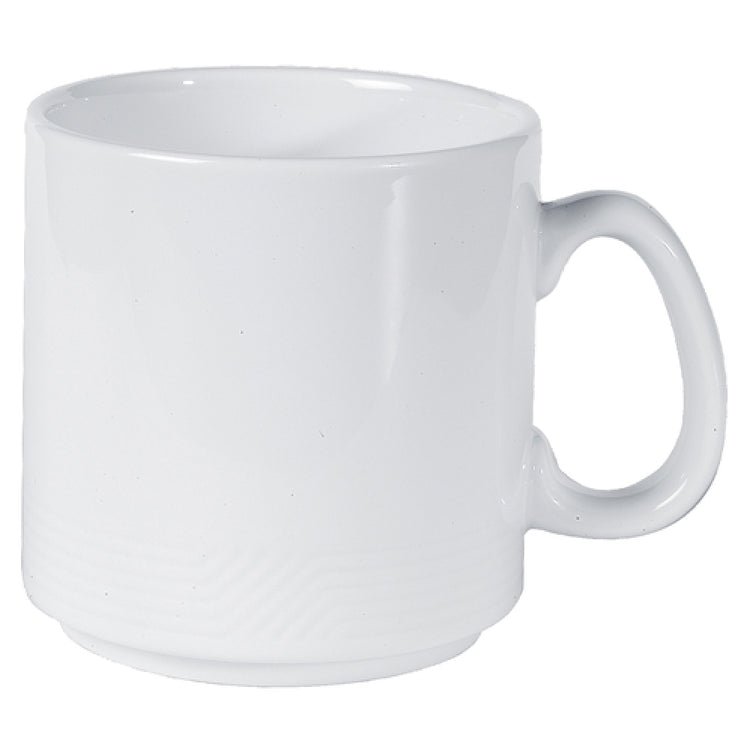 The Steelite 61106ST0583 Mug is constructed from durable Royal Porcelain, incorporating 47% bone ash for enhanced strength and thermal performance. Its dimensions include a width of 4.5 inches and a height of 3.38 inches, with a total weight of 28.88 pounds per case packed in units of three dozen mugs. The non-stackable design ensures stability during use, and the surface finish presents an elegant Contessa pattern. It is suitable for commercial dishwashing and withstands thermal shocks typical in high-turnover foodservice environments. The mug's standard capacity aligns with typical serveware protocols, making it a reliable addition for cafes, restaurants, and institutional dining halls aiming for resilience and presentation consistency.
