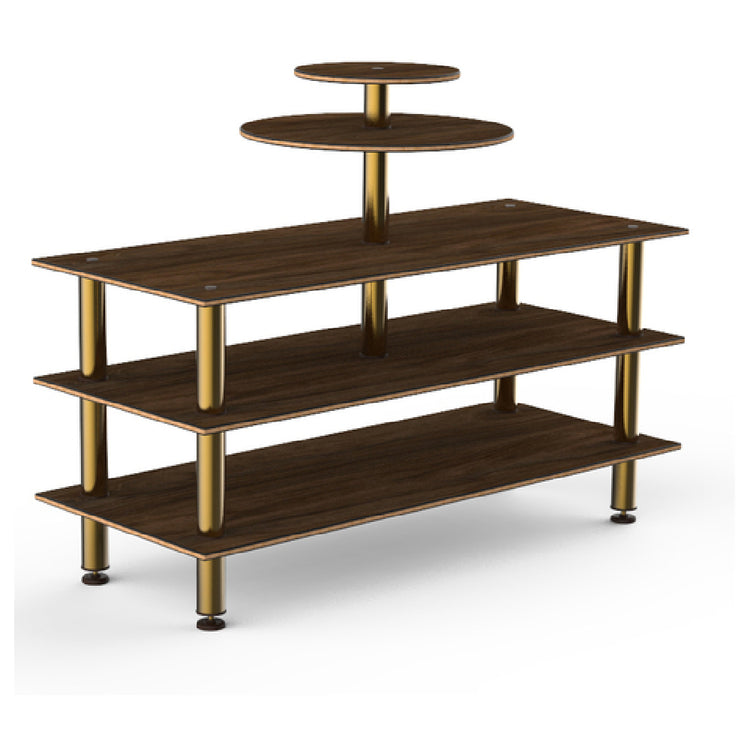 The Steelite Mogogo Buffet Solutions Modular Multi-Purpose Display 3-tier (Model Number: MGCMLB12WBXF) is a commercial-grade buffet table designed for versatile food presentation and service in professional settings. Crafted by Steelite International, it features a rectangular configuration measuring 75 inches in width, 29-1/2 inches in depth, and 53-1/2 inches in height. Its laminated wood construction combines Bengali mango wood BHP high pressure laminate with a bamboo core top, ensuring durability and stain resistance. Equipped with two tier round shelves and brushed brass legs, this modular display prioritizes stability, aesthetic appeal, and easy maintenance. Engineered for high-performance in foodservice environments, it supports multi-tiered presentation styles and large-volume service, making it suitable for hospitality venues, catering events, and high-traffic buffets.