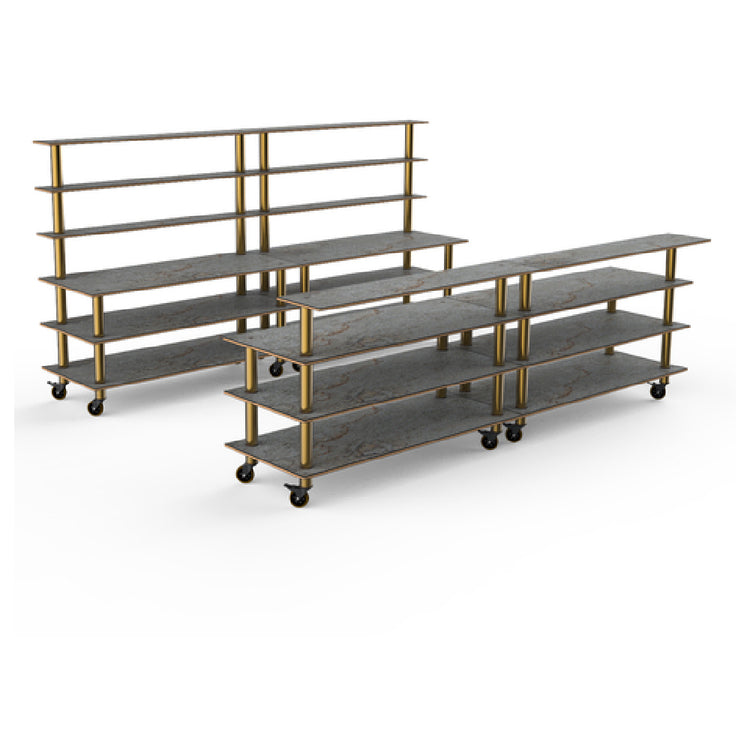 The Steelite Mogogo Buffet Solutions Modular Double Bar (model number MGCMLC11GBXW) is a professional-grade, restaurant-ready modular buffet station designed for commercial foodservice environments. Featuring two interconnected units, including a 142" x 29-1/2" x 73" high back bar and a 142" x 34-1/2" x 47-1/2" high front bar, it offers a durable construction with grey slate BHP high-pressure laminate tops reinforced by a bamboo core. Equipped with brushed brass casters for mobility, the unit arrives in a knocked-down configuration, facilitating efficient setup and maintenance. Whether used in upscale catering venues, banquet halls, or large-scale events, this modular solution provides both functional elegance and precise technical specifications suited for sophisticated foodservice demands.