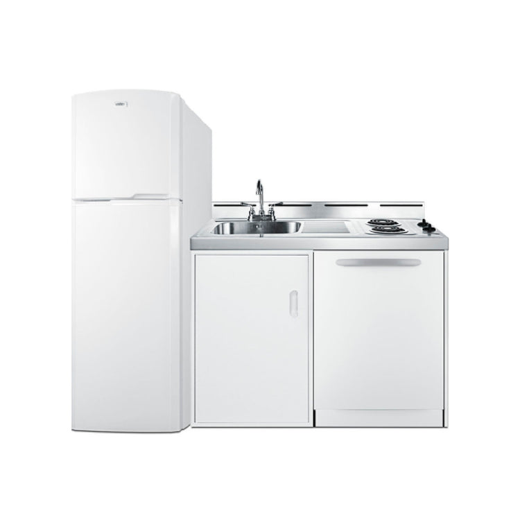 The Summit ACKDW72 All-in-One Combination Kitchenette with Dishwasher is a commercial-grade culinary workstation designed for integrated food preparation environments. This 72-inch wide kitchenette combines essential appliances including a two-burner coil cooktop powered by a 115V pre-installed three-prong plug, a full-size refrigerator and freezer unit measuring 22 inches in width, and a 24-inch wide ENERGY STAR® certified dishwasher featuring eight wash programs. The unit’s stainless steel countertop and work surface provide durability and ease of maintenance, while frost-free refrigeration and reversible door configurations optimize kitchen workflow. With a total footprint of 72 inches in width and a height of 40 inches, this kitchenette supports efficient space utilization in professional foodservice operations, especially where streamlined, all-in-one solutions are required for moderate-volume catering, prep stations, or compact kitchens.