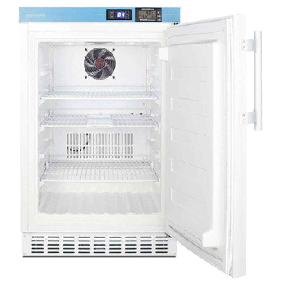 Summit Commercial, ACR45LCAL, Accucold Pharmaceutical Undercounter All-Refrigerator, built-in or freestanding, one-section, 19-1/2"W, 2.65 cu. ft. capacity, bottom mount self-contained refrigeration, 2° to 8°C temperature range, (1) solid hinged door (locking), (3) adjustable wire shelves, high/low temperature alarm, frost-free defrost, NIST calibrated digital thermostat, LED lighting, white interior & exterior, levelling legs, R600a Hydrocarbon refrigerant, 115v/60/1-ph, 1.0 amp, ADA Compliant, ETL-Sanitation, ETL, cETL (Commercial)