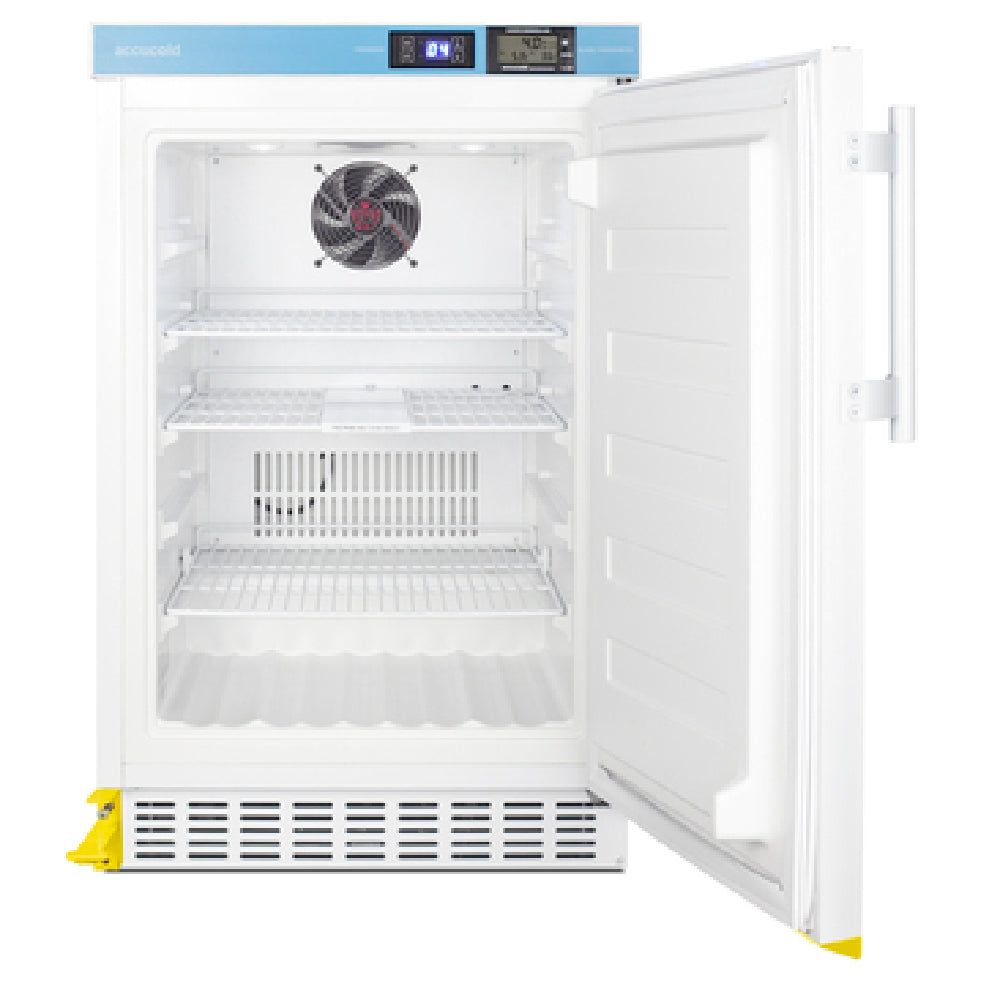 The Summit ACR45LCALSTO Accucold Pharmaceutical Undercounter All-Refrigerator is a commercial-grade refrigeration solution designed for medical and foodservice environments requiring precise temperature control. Featuring a self-contained, bottom-mounted cooling system, this one-section unit offers 2.65 cubic feet of interior capacity within a compact 19-1/2" width. Its solid hinged door with lock capacity ensures secure storage, while the frost-free defrost system and NIST calibrated digital thermostat maintain consistent temperatures between 2°C and 8°C. Constructed with an all-white exterior and interior, LED lighting enhances visibility, and adjustable wire shelves facilitate customizable storage configurations aligned with medical or pharmaceutical workflows. The unit is suitable for built-in or freestanding installation, optimized for spaces demanding reliable, sanitary refrigeration for sensitive products. The R600a hydrocarbon refrigerant ensures efficient operation with minimal environmental impact, making it ideal for clinical, laboratory, or pharmaceutical storage environments requiring strict temperature and sanitation standards.