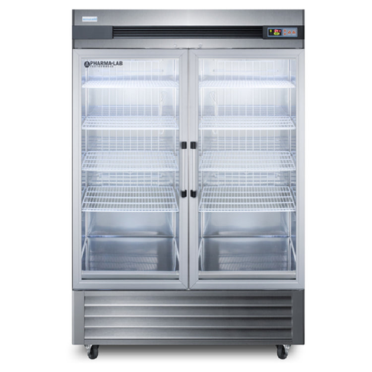 The Summit ARG49ML Medical Refrigerator features (2) self-closing glass french doors with locks, eight adjustable wire shelves, and four casters (including 2 locking), facilitating flexible and secure storage. The unit’s forced-air cooling and digital thermostat enable accurate temperature regulation, while interior lighting enhances visibility. An open door alarm and temperature alert system support safety and compliance with medical storage protocols, simplifying maintenance in busy healthcare settings. Designed for moderate workloads, it ensures reliable operation with stainless steel construction that withstands rigorous use, making it ideal for clinical laboratories, pharmacies, and hospital storage rooms.