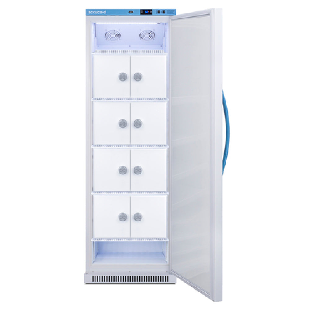 Summit Commercial, ARS15PVLOCKER, Accucold Pharma-Vac Upright Medical All-Refrigerator, 15 cu. ft. capacity, microprocessor digital controls, 2°-8°C temperature range, adjustable automatic defrost, (8) interior locking compartments with combination locks and key override, LED lighting, remote alarm contacts, access port, temperature alarm, open door alarm, reversible right-hand swing locking solid door, white cabinet, interior fan, R600a Hydrocarbon refrigerant, 115v/60/1-ph, 1.4 amps, cETLus (Medical)