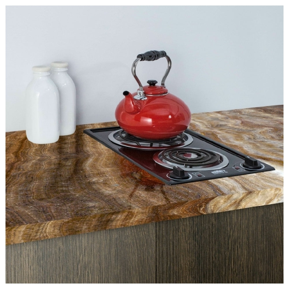 A commercial electric hotplate is a stationary cooking appliance featuring flat heating elements designed for professional kitchen environments. The Summit CCE226BL, a model of electric built-in hotplate, incorporates two flat spiral burners operating at 675W and 950W, housed on a durable black porcelain surface. Installed in undercounter café stations or behind-service counters, this unit provides consistent heat suitable for medium-volume food preparation, ensuring operational efficiency and precise temperature control in restaurant or institutional settings.