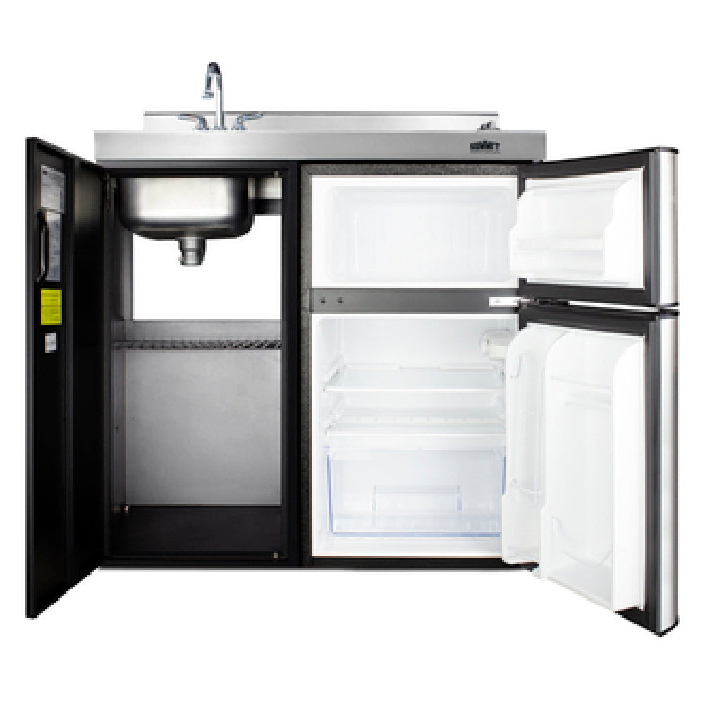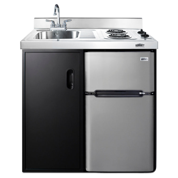 A commercial kitchenette is a compact, integrated food preparation unit designed for restaurant, catering, or hospitality environments to combine cooking, cleaning, and storage functions within a small footprint. The Summit CK36EL features a stainless steel top with a deep drawn sink, electric cooktop, and refrigerator-freezer, making it suitable for gastronomic applications needing space-efficient, durable equipment capable of supporting moderate throughput operations in busy foodservice settings.