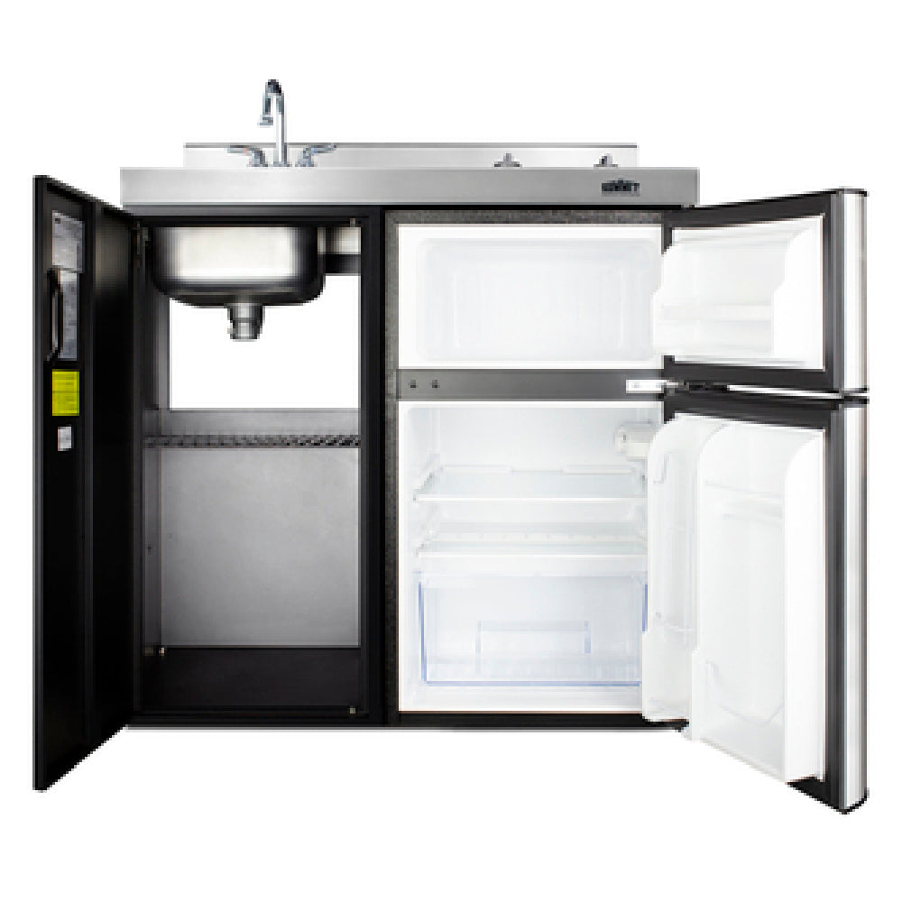 Summit Commercial, CK36ELGLASS, All-in-One Kitchenette, 36.13"W x 24.63"D x 40"H, one piece stainless steel top with deep drawn sink, faucet, (2) glass burner electric cook top, 3.2 cu.ft. refrigerator-freezer with cycle defrost (CP34BSS), lower cabinet storage compartment with shelf, black & stainless steel door finish, black metal sides (ships on one pallet), 1.5kW, (2) 115v/60/1-ph, 13.1 amps, ETL, cETL (Residential)