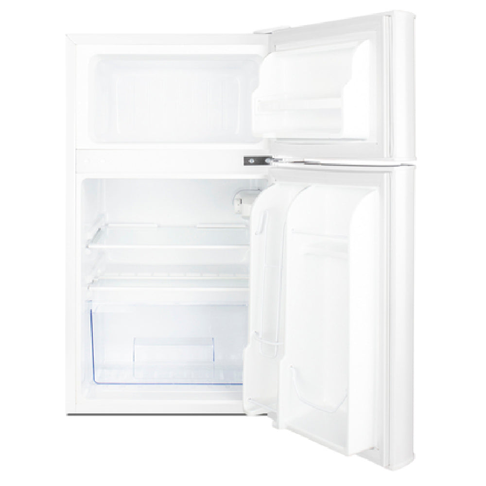 Summit Commercial, CP34W, Compact Refrigerator/Freezer, freestanding, one-section, 19"W, 3.2 cu. ft. capacity, rear mount self-contained refrigeration, (2) solid hinged doors, (1) adjustable glass shelf, (2) full door shelves, can storage, (1) crisper drawer, cycle defrost, dial thermostat, LED lighting, white interior & exterior, levelling legs, R600a Hydrocarbon refrigerant, 115v/60/1-ph, 1.1 amps, ULC, UL (Residential)
