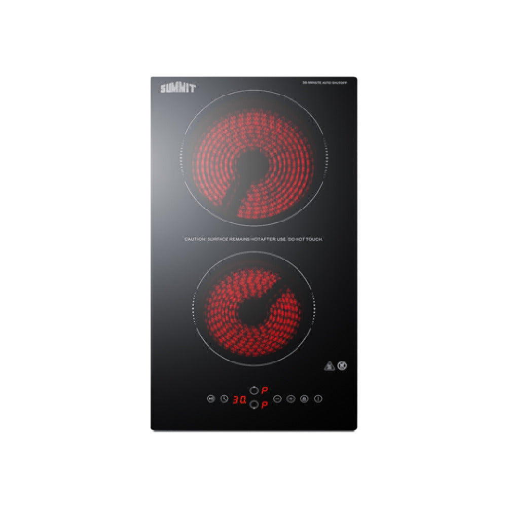 Summit CRH2BT30230 distinguishes itself from similar commercial cooktops by combining a sleek ceramic glass surface with robust electrical performance and safety features like automatic shutoff and residual heat indicators. Its durable construction, compact design, and user-friendly digital controls enhance operational efficiency and safety in high-demand foodservice environments. The unit’s compatibility with standard commercial electrical systems and ADA compliance support flexible installation and safe operation across a variety of professional kitchen workflows.