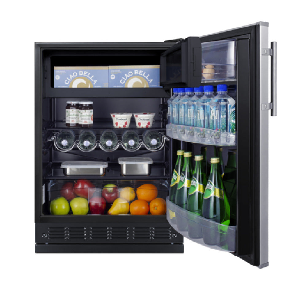 Summit Commercial, CT66BK2SSRS, Refrigerator-Freezer, 24" wide, 4.9 cu.ft, black exterior, counter height dimensions, height adjustable, leg shield included, smudge-proof stainless steel door, stainless steel handle, door storage, reversible door, automatic defrost operation in the fresh food section and efficient manual defrost operation in the freezer compartment, automatic interior light, black interior, removable crisper drawer, (3) adjustable glass shelves, bottle shelf included, 2 level legs, dial controls, quiet operation, R600a hydrocarbon refrigerant, CARB compliant, 100% CFC free, 115v/60/1-ph, UL, UL-C (Residential)