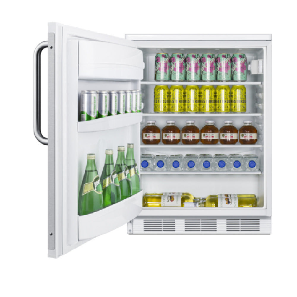 The Summit FF6W7BZLHD all-refrigerator caters to commercial foodservice buyers needing dependable storage. It offers precise temperature regulation, door storage, and a white interior suitable for professional kitchens. Its self-contained, bottom-mounted cooling system facilitates maintenance, while the brushed stainless steel handle ensures durability. Designed for reliable use in moderate workloads, it supports consistent food preservation, ideal for restaurant, convenience store, or healthcare applications.