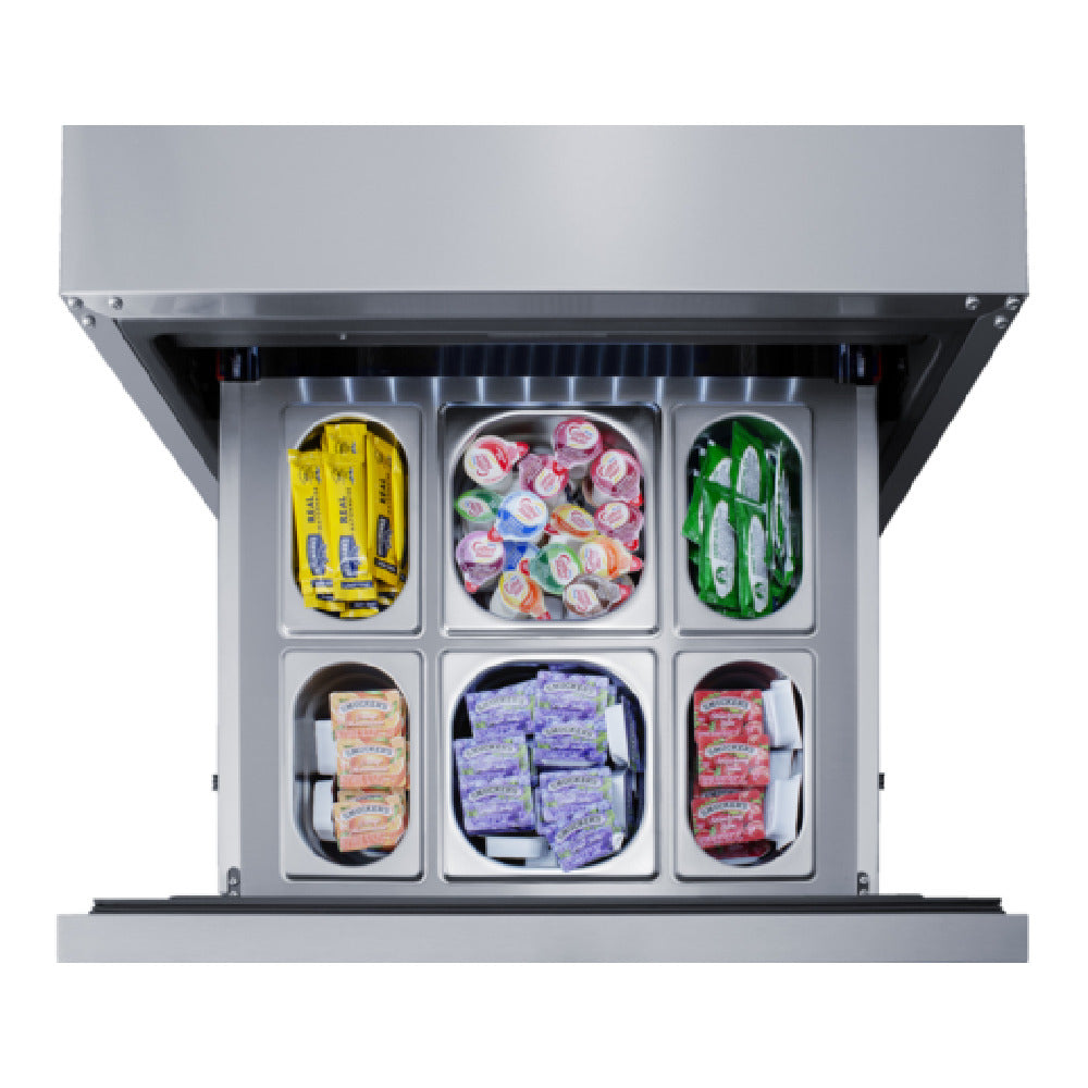 Summit KITADRD24 stands out for its precise fit, robust stainless steel build, and seamless integration with ADRD24 units. Its removable pan design simplifies cleaning and workflow, reducing downtime. The durable construction and included covers improve sanitation and product presentation, making it a reliable choice for high-demand commercial kitchens seeking efficient storage solutions.