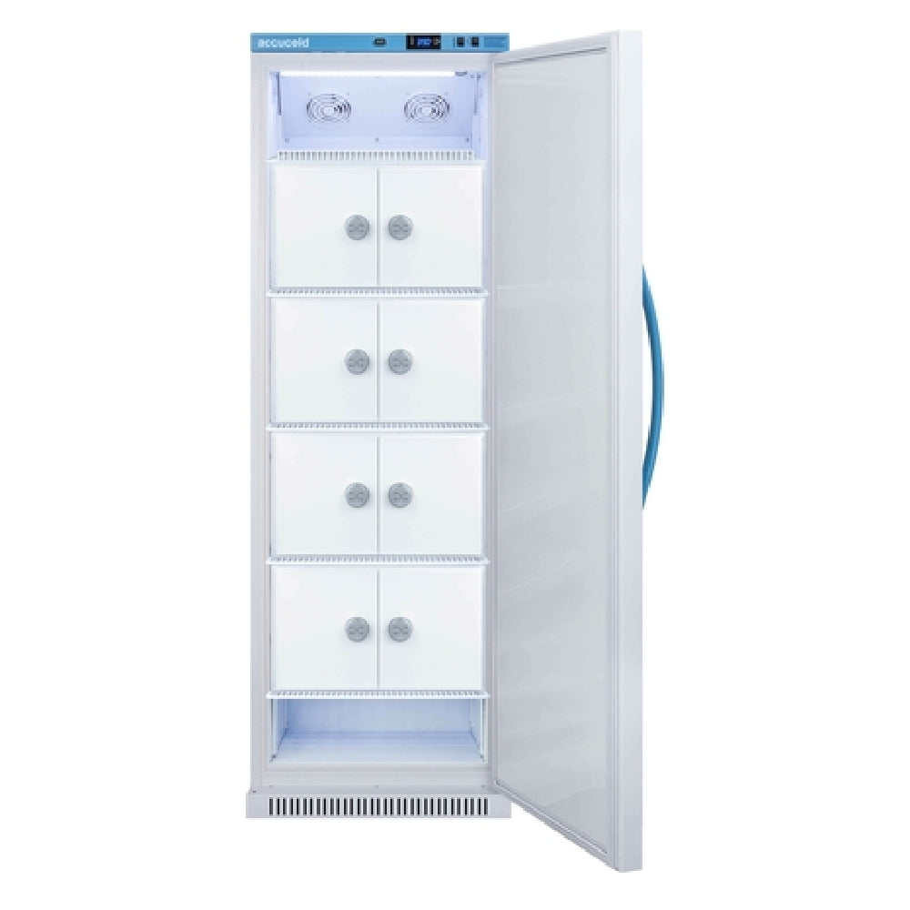 A commercial breast milk refrigerator is a specialized refrigeration unit designed for the safe storage of expressed breast milk in healthcare, childcare, or clinical settings. These units operate with precise temperature controls, secure locking mechanisms, and organized storage compartments to meet strict safety standards. The Summit MLRS15MCLK Accucold MOMCUBE™ is a single-section, 15 cubic foot model with a solid hinged door, interior LED lighting, and internal lockers, ideal for hospital, clinic, or daycare use, supporting reliable preservation in moderate-volume milk collection environments.