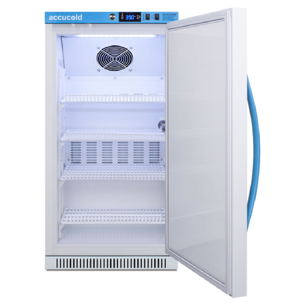 The Summit MLRS32BIADAMC Accucold MOMCUBE™ Breast Milk Refrigerator One-section is a commercial-grade undercounter refrigeration unit designed for healthcare facilities, maternity wards, and specialized clinical environments. This single-door, 18-1/2" wide unit features self-contained rear-mounted hydrocarbon refrigeration with R600a refrigerant, providing precise temperature control within a 33 to 40°F preset range. Its solid, reversible door with lock ensures secure storage, while interior LED lighting enhances visibility. With a 2.83 cubic foot capacity and four adjustable wire shelves, the refrigerator supports organized storage of breast milk, formula, and related supplies. Equipped with automatic defrost, digital thermostat, temperature, open door, and power loss alarms, it ensures optimal preservation and safety for sensitive contents. The white exterior finish complements clinical environments, and the unit operates efficiently on 115V/60Hz power with a minimal 0.75 amp draw. Certified by ETL and cETL, it meets medical safety standards for healthcare use.