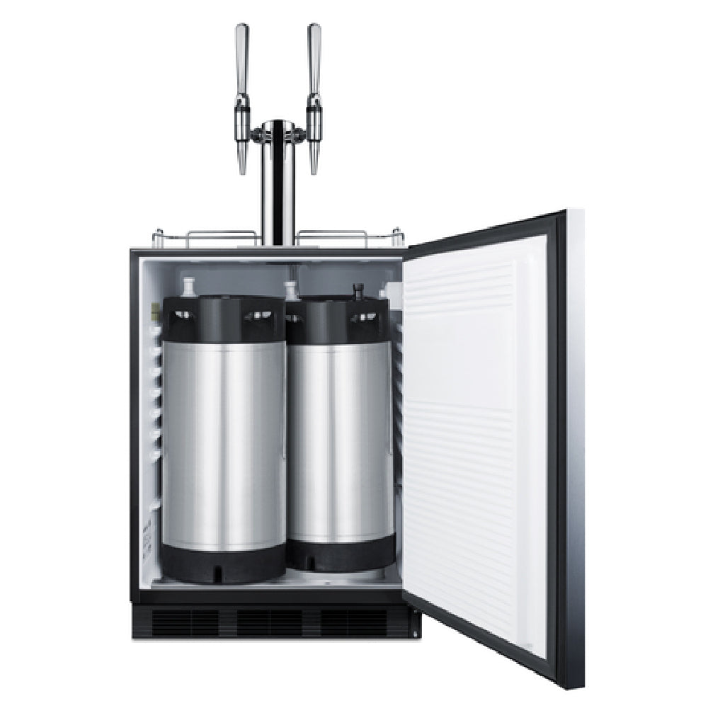 The Summit SBC58BLBIADANCFTWIN Nitro Cold Brew Coffee Dispenser is a commercial-grade beverage equipment designed for high-volume caffeine dispensing applications. This unit features a built-in or freestanding configuration with a 24" width and a 5.5 cubic foot storage capacity, accommodating two Cornelius kegs. Its precise temperature range of +34°F to +43°F is maintained via a dial thermostat, supported by automatic defrost functionality. Crafted with a robust 304 stainless steel interior and exterior, the dispenser includes dual stainless steel draft towers with stout taps, nitrogen regulator, and ball lock connections, ideal for efficient cold brew service. Its ADA compliance ensures accessibility, and the unit operates with a 115V power supply using environmentally friendly hydrocarbon refrigerant. Designed for reliable performance, it meets commercial standards with surge-free quiet operation and hygienic construction suitable for busy coffee service settings. The seamless interior liner, removable drip tray, interior lighting, and exterior fan contribute to ease of maintenance and sanitation. Specifications such as a reversible right-hinged door, stainless steel guard rail, and mounting versatility enhance integration into various commercial environments.