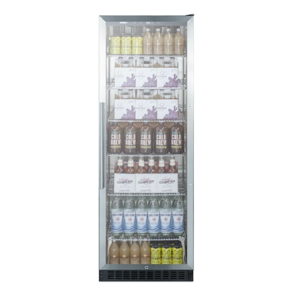 The Summit SCR1401CSS Beverage Center One-section Freestanding is a commercial-grade refrigeration unit designed for foodservice environments requiring reliable beverage storage and display. This 24-inch-wide, self-contained merchandiser features a durable stainless steel exterior and interior, optimized for high-traffic hospitality settings such as cafes, convenience stores, and catering operations. Its low-profile height of 69.75 inches allows for seamless integration with existing kitchen or bar setups. Equipped with hinged glass doors with stainless steel trim, it offers clear visibility and ease of access to stored beverages. The unit’s 12.6 cubic feet capacity and six adjustable chrome shelves facilitate organized storage, while a digital thermostat with internal fan ensures consistent temperature regulation. Its R600a hydrocarbon refrigerant enhances energy efficiency, making it suitable for demanding commercial applications with a focus on sustainability and performance. The SCR1401CSS combines precise temperature control with robust construction, providing a dependable solution for professional beverage merchandising.