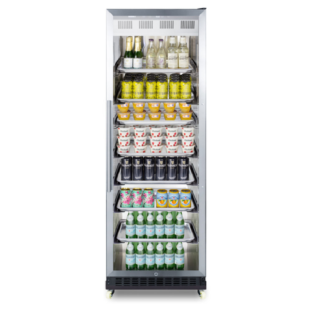 The Summit SCR1401RI Beverage Center One Section is a commercial-grade refrigeration unit designed for dispensed beverage storage and merchandising within professional foodservice environments. Featuring a 12.6 cubic foot capacity, this model is equipped with self-contained, bottom-mounted refrigeration to ensure consistent product temperature. Its hinged glass door with lock provides clear visibility and security, while the stainless steel interior enhances durability and sanitation. The unit includes seven adjustable tray holders on cantilevered shelving, seven aluminum half sheet pans, and seven chrome shelves, allowing flexible organization tailored to high-volume beverage presentations. Digital controls and LED lighting facilitate precise temperature management and visibility in busy commercial kitchens or bars. Constructed with a black exterior finish and utilizing environmentally friendly R600a hydrocarbon refrigerant, this beverage center supports efficient operation and compliance with modern standards. Overall, the SCR1401RI combines technical proficiency with robust build quality, making it a reliable solution for professional beverage merchandising and storage needs.