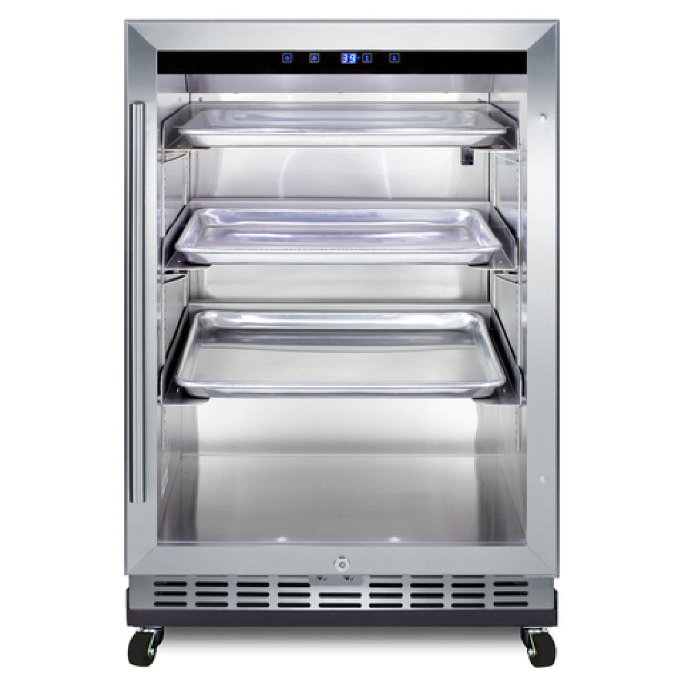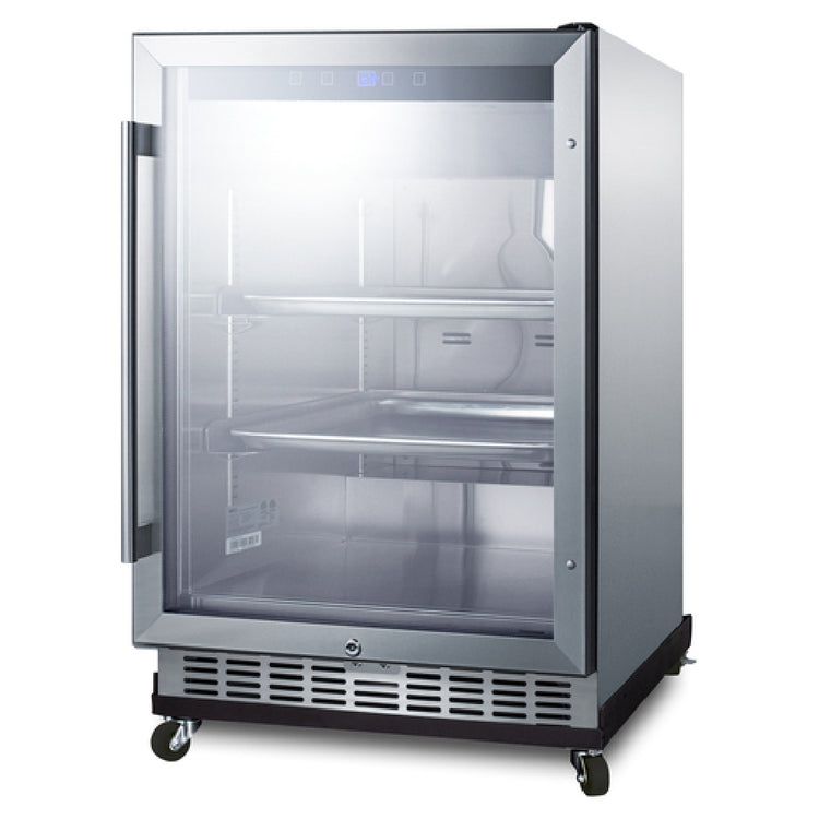 The Summit SCR611GLOSRI Outdoor Refrigerator Undercounter Reach-In is a commercial-grade refrigeration unit designed for outdoor foodservice applications. This 5 cubic foot capacity reach-in features a durable field-reversible glass door with a lock, ensuring secure access to stored contents. Constructed exclusively with stainless steel interior and exterior, it guarantees corrosion resistance and longevity in challenging environments. Equipped with LED lighting for efficient visibility, digital controls for precise temperature management, and environmentally friendly R600a hydrocarbon refrigerant, this unit exemplifies high-performance outdoor refrigeration suitable for restaurant patios, catering setups, and hospitality venues. Its compact footprint provides seamless integration into various commercial kitchen configurations, optimizing workflow and product presentation. The model's technical specifications include a height of 37.38 inches, width of 23.38 inches, depth of 23.5 inches, and a shipping weight of 150 lbs, making it a robust solution for demanding outdoor refrigeration needs.