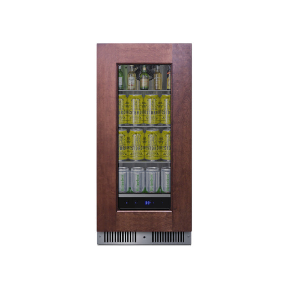 A commercial beverage cooler is a refrigerated unit designed for installing in foodservice environments that require reliable, consistent cold storage and display of beverages. The Summit SDHG1533PNR model, with its self-contained, frost-free cooling system, temperature range from 36°F to 43°F, and a compact 15-inch width, is ideal for undercounter use in bars, cafes, and catering settings. Its hinged glass door with stainless steel trim provides clear product visibility and professional presentation while maintaining optimal temperature control. This unit is suited for moderate throughput applications, supporting efficient workflow in small to medium-sized foodservice venues.