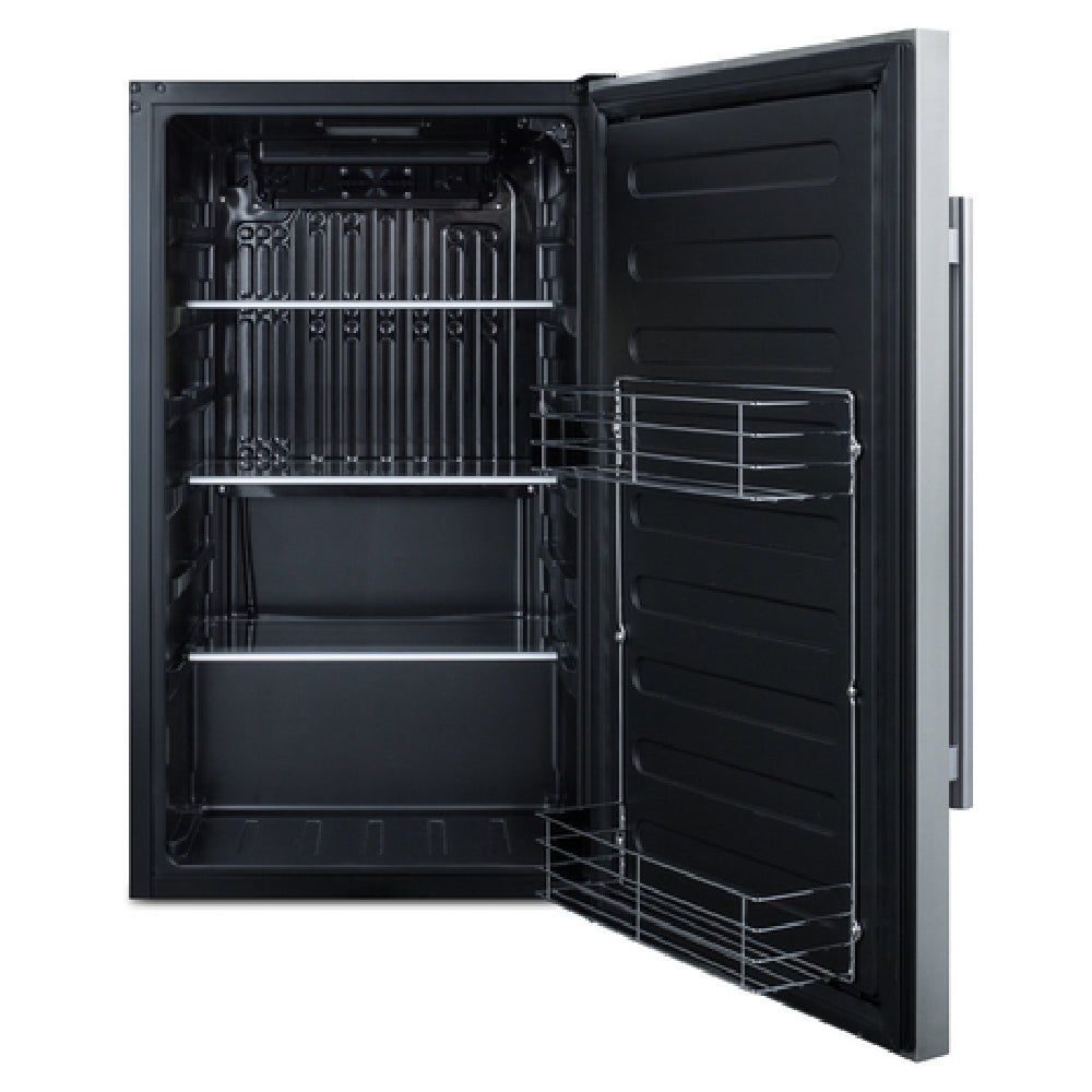 The Summit SPR196OSADA Outdoor All-Refrigerator is a commercial-grade refrigeration unit designed for versatile installation as either a built-in or freestanding appliance. This 19-inch wide all-refrigerator features a robust stainless steel hinged reversible door with a lock, providing security and durability in outdoor foodservice environments. With a capacity of 3.13 cubic feet and an adjustable temperature range of 34 to 50ºF, it ensures optimal cooling for perishables. The self-contained, rear-mounted refrigeration system supports consistent temperature control, while automatic defrost reduces maintenance requirements. Its black exterior finish with stainless steel handle complements various outdoor settings, making it suitable for restaurants, bars, and hospitality applications involved in food storage and presentation at high-volume venues.