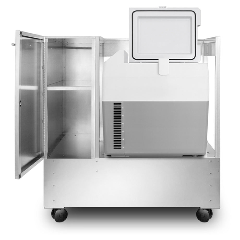 The Summit Commercial SPRF36CART Portable Refrigerator-Freezer Cooler (SPRF36) with mobile cart is a commercial-grade refrigeration device designed for precise temperature control and durability in foodservice environments. Featuring a 1.0 cubic foot (28-liter) capacity and capable of reaching -15°C, this unit is ideal for storing perishable items in restaurants, catering operations, or portable food service setups. Its manual defrost system, digital temperature controls with external LED display, and side-mounted compressor ensure optimal performance. The unit's aluminum interior and gray exterior complement its robust stainless steel cart, which provides mobility, stability, and integrated storage solutions for busy commercial settings.
