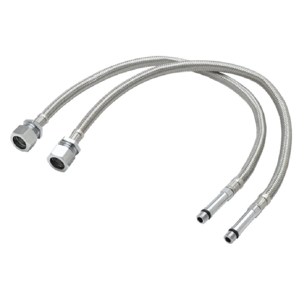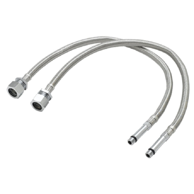 The T&S Brass 012534-45 compression fitting nut features a stainless steel outer braiding of 19-5/8" length, ideal for flexible supply line connections requiring robust durability. It is engineered with a 1/2" NPSM male threading compatible with standard plumbing fixtures. Made from low lead content materials, the fitting ensures safe, compliant fluid transfer suitable for foodservice environments. Its construction supports operation within typical temperature ranges, resisting corrosion and wear over extensive service periods. Weighing approximately 0.6 lbs, this fitting is designed for simple installation and quick maintenance. The part includes two hoses, making it strongly suited for multi-connection applications in commercial plumbing setups.