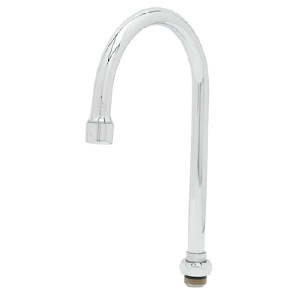 The T&S Brass 133X Nozzle Swivel 10-5/16" H is a commercial-grade gooseneck faucet nozzle designed for high-demand foodservice environments. Crafted from chrome-plated low-lead brass, it provides durability and corrosion resistance. This swivel nozzle features a 10-5/16-inch height, a 5-3/4-inch spread, and a stream regulator outlet, making it ideal for precise water flow control in busy kitchens, beverage stations, and dishwashing setups. Its compact, robust construction ensures reliable performance under continuous use, and the stream regulator outlet helps optimize water usage while maintaining effective flow rates.