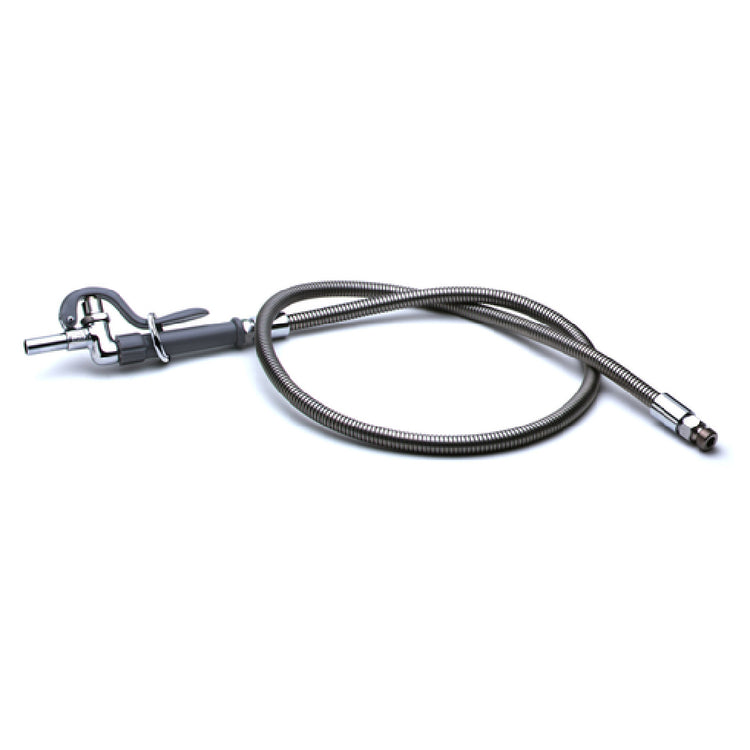 The T&S Brass B-0102-B appliance features a robust construction with a 4-pound weight and a model number B-0102-B. Designed for long-term durability, it includes an integrated automatic shut-off valve and a straight nozzle for efficient water dispensing. The unit operates with a standard ½" IPS male inlet that ensures compatibility with a variety of plumbing systems. Constructed primarily from stainless steel, it resists corrosion and is built for demanding commercial kitchen use. The overall length of 6 inches and flexible 5-foot hose facilitate versatile placement, while the component meets standard foodservice installation requirements. Maintenance involves straightforward cleaning of stainless steel components, with disassembly accessible for periodic inspection and part replacement.