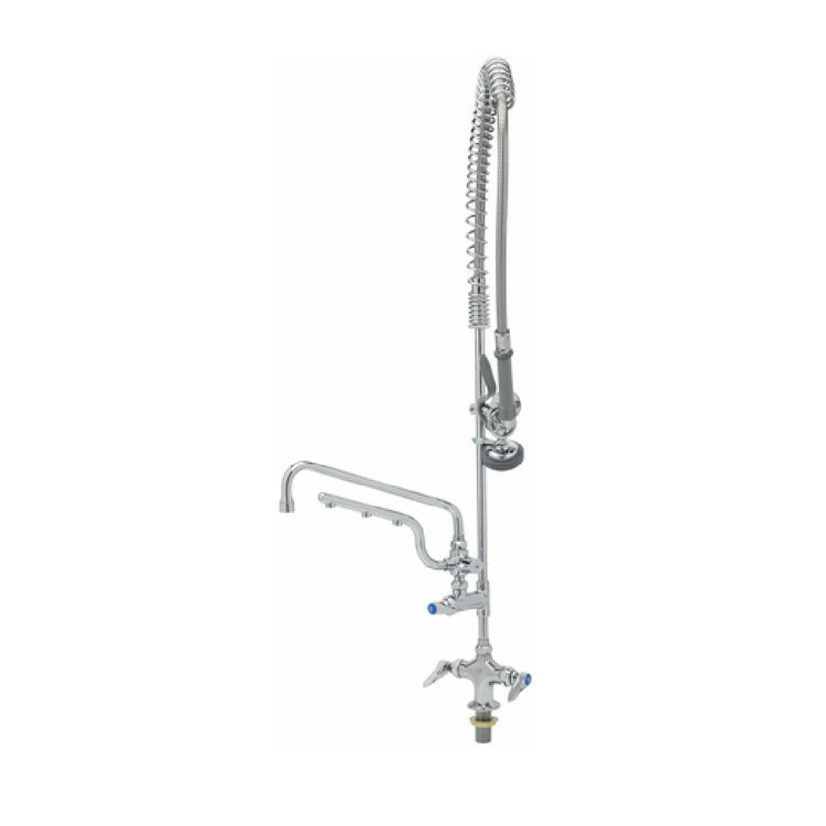 The T&S Brass B-0113-U12-B UltraRinse Single Hole Deck Mount Mixing Faucet is a professional-grade plumbing fixture designed for commercial foodservice environments. Crafted from polished chrome plated brass, this single inlet faucet features a 12-inch swivel spout with stream regulator outlet, providing precise water flow control. Equipped with a compression cartridge with spring check, lever handles, and a 10-1/2-inch multiple tip 1.5 GPM swivel spray arm, it facilitates efficient operation in high-demand kitchen settings. The inclusion of a 24-inch riser, 44-inch flexible stainless steel hose with heat-resistant handle, and a 1.15 GPM spray valve further enhances workflow versatility. This deck-mounted unit complies with industry standards for durability and safe operation, making it suitable for busy commercial kitchens needing reliable, high-performance mixing faucets.