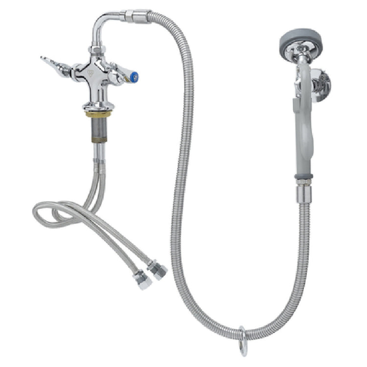 The T&S Brass B-0160 Spray Assembly Deck Mount Single Hole Mixing Faucet is a professional-grade kitchen fixture designed for precise water control and durability in commercial foodservice environments. Crafted from polished chrome-plated brass, this faucet features a single-hole deck mount installation suitable for bustling kitchens and prep stations. Its quarter-turn Eterna cartridges incorporate spring checks to ensure leak-free operation, while the lever handles with color-coded indexes facilitate quick temperature adjustments. The 90° swivel adapter arm and flexible stainless steel hose with heat-resistant gray handle optimize maneuverability and user ergonomics. The 44" hose length and 1.15 gpm spray valve enable efficient rinsing and cleaning tasks, making it ideal for food prep, dishwashing, or sanitation stations. With a robust construction and precise technical specifications, this faucet enhances operational efficiency and workflow in commercial kitchen settings.