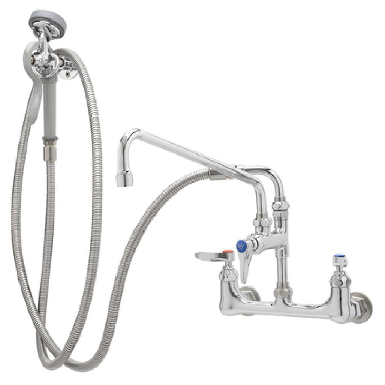 T&S Brass, B-0175-06, Spray Assembly, wall mount mixing faucet with 8" adjustable centers, EasyInstall add-on faucet, 8" swing nozzle with stream regulator outlet (060X), quarter-turn Eterna cartridges with spring checks, lever handles with color coded indexes, 90° swivel adapter arm, 68" flexible stainless steel hose with heat-resistant gray hose & hold down ring, 1.15 GPM angled spray valve (B-0107-035), wall hook, polished chrome-plated brass faucet body, 1/2" NPT female inlets, CSA