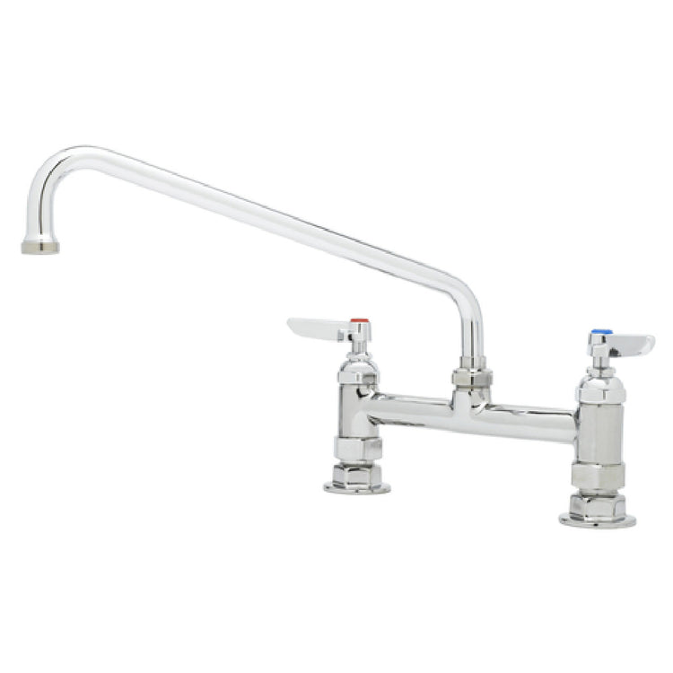 This deck mount mixing faucet offers a resilient low-lead construction suitable for commercial kitchens, with a 12-14" swivel spout for extensive reach. Its quarter-turn Eterna cartridges facilitate quick water temperature adjustments, and lever handles optimize ease of operation. The 8" centership design simplifies installation on existing deck configurations, ensuring seamless integration into busy food prep areas. Designed for durability, it withstands frequent use while providing precise mixing control. The faucet's flanged inlets accommodate 1/2" IPS eccentric female connections, ensuring plumbing compatibility, and its low-maintenance construction reduces downtime during routine sanitation or repairs.