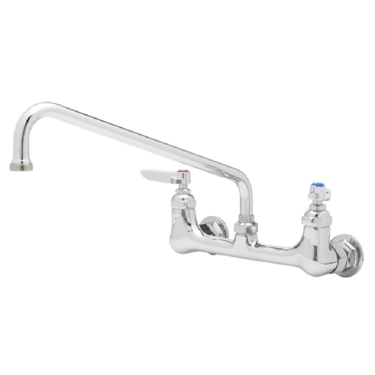 The T&S Brass B-0244 Sink Mixing Faucet is a commercial-grade wall-mounted faucet designed for precise water control in foodservice and industrial kitchens. Featuring a 12" swivel nozzle and 8" on-center wall mount, it provides optimal reach and flexibility for sink applications. Crafted from durable materials with low lead compliance, it includes 1/2" NPT female eccentric inlets and female elbows, with renewable seats ensuring long-term performance. Operating at 2.2 GPM, it incorporates aerator technology for efficient water flow, and utilizes quarter-turn Eterna cartridges for smooth operation. This faucet is engineered for reliable performance in demanding environments where hygiene, durability, and ease of maintenance are priorities.