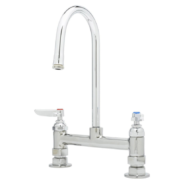 The T&S Brass B-0320 Faucet Deck-mount 8" Center is a commercial-grade plumbing fixture designed for precise, hygienic water delivery in professional foodservice environments. It features a sturdy construction specifically engineered for deck-mounted installation, with an 8-inch center-to-center configuration ensuring compatibility with a variety of commercial sinks. The faucet incorporates a rigid gooseneck nozzle for extended reach and controlled flow, and utilizes 1/2" IPS eccentric flanged female inlets for straightforward plumbing connections. Equipped with quarter-turn Eterna cartridges and lever handles, this model provides reliable operation and ease of maintenance. Its low lead compliance ensures safety and sustainability in high-demand kitchen settings, making it suitable for food prep stations, dishwashing areas, and other commercial water applications requiring durable, precise fluid dispensing.